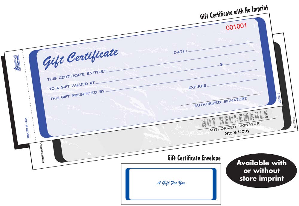 The GC-NI is a traditional Gift Certificate. A top copy for the customer and a carbonless copy for your store records. Comes with a presentation envelope. The GC-NI is identical to the GC-IMP except it does not have your Company Information imprinted on the form.
